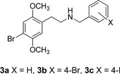 Two decades ago, Glennon et al.19 reportedthat the affinities of theN-benzyl compound3a, as well as the 4-bromo- and 4-iodo-N-benzylcompounds,3b and3c, respectively, were2–3 times higher than that of the parent primary amine. Therehave been no further reports on these compounds, and in our own work,we had never examined 3- or 4-substituted benzyl substituents in thephenethylamine series.