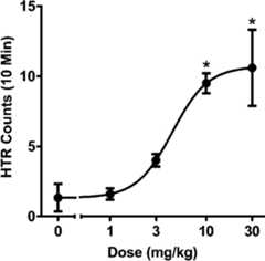 HTR counts were analyzedusing one-way analysesof variance (ANOVAs). Post-hoc comparisons were made using Tukey’sstudentized range method. Significance was demonstrated by surpassingan α-level of 0.05. ED50 values and 95% confidencelimits were calculated using nonlinear regression. These data arereported in Table4.