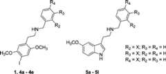 Thus, in this article wedescribe the facile synthesis of compounds1,4a–4e, and5a–5l, preliminary screening at a variety of 5HTfamily receptors, and more detailed testing at human 5-HT2A, 5-HT2B, and 5-HT2C receptors, including affinitymeasurements using displacement of the agonist radioligand [125I]-DOI and functional effects in elevating intracellular calcium.We also present behavioral data for the mouse head twitch response(HTR) as a measure of in vivo 5-HT2A receptor activation.23