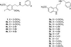 On the basis of the hypothesis that the original datawere associatedwith an isomer other than the 4-bromo compound, we subsequently discoveredthatN-3-bromobenzyl compound5e didhave higher affinity for the 5-HT2A receptor (Ki 1.48 nM), compared to that of the 4-bromocongener5f (Ki 11.2 nM). Further, the effect of an ortho-oxygenatedN-benzyl appeared not to be significant for affinity inthe tryptamine series, suggesting perhaps different binding orientationsof theN-benzyltryptamines versus theN-benzylphenethylamines within the receptor. That is, compound5a has been reported to have agonist potency (pEC50 7.08) in a rat tail artery assay not significantly different fromthe compound with an unsubstitutedN-benzyl moiety(pEC50 7.00), although theEmax was slightly higher for the 2′-methoxy compound.18 These findings prompted us to synthesize a smallseries of structurally related congeners to determine whether othersubstitutions might have even greater affinity and/or selectivityfor the 5-HT2A receptor.
