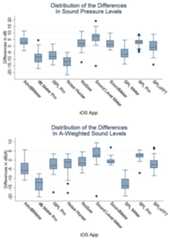 Figure 3 shows box plots of the distribution of differences between the app measurements and the reference microphone in unweighted and A-weighted sound levels for the four iOS devices tested.