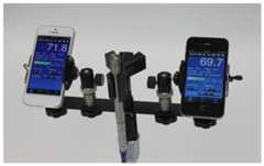 (Color online) The SoundMeter app on the iPhone 5 (left) and iPhone 4S (right) compared to-in. Larson-Davis 2559 random incidence type 1 microphone (center).
