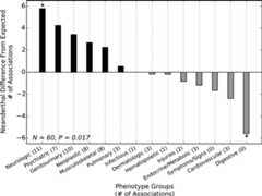 Each bar gives the difference between the number of replicated Neanderthal SNP associations with a phenotype group (at a relaxed discovery threshold ofP < 0.001) and the number expected from a PheWAS over five sets of non-Neanderthal sites matched to the allele frequency of tested Neanderthal SNPs. The phenotype distributions were significantly different (chi squared test,P = 0.017), with more Neanderthal SNPs associated with neurological and psychiatric phenotypes than expected and fewer digestive phenotypes. The enrichment and depletion were consistent across all five matched non-Neanderthal sets (* indicatesP < 0.05 for all five comparisons; binomial test) (11).
