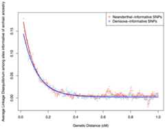 Average linkage disequilibrium (Lewontin’s D) as a function of distance in Oceanians for SNPs informative of Neanderthal (red) and Denisovan (blue) ancestry. The Denisova decay is slower implying a more recent date.