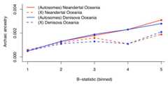 We tested the relationship between archaic ancestry and regions of strong linked selection as measured by a B-statistic [21]. Neanderthal ancestry decreases in proximity to functional elements in all populations (ρSpearman=0.25–0.29;Figure 3C,Supplemental Experimental Procedures, section S5.1;Table S6), as does Denisovan ancestry in Oceanians (ρSpearman=0.26,Table S6), likely reflecting greater selection against Neanderthal ancestry in low B-statistic regions [15–18]. Power to detect archaic ancestry is elevated close to regions of linked selection due to a reduction in the rates of incomplete lineage sorting caused by the lower effective population size in these regions [15] so these results are not artifacts of reduced power. Thus, similar processes appear to have worked to remove Neanderthal and Denisovan ancestry near genes.