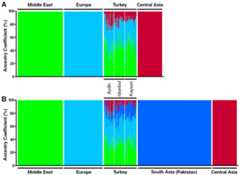 Supervised clustering with STRUCTURE (Falush et al., 2003) was also used to analyze the Turkish genetic ancestry by forcing separate clustering of HGDP populations. Supervised analysis was performed using individuals from the Middle East (Druze and Palestinian), Europe (French, Italian, Tuscan, and Sardinian), and Central Asia (Uygur, Hazara, and Kyrgyz) at K = 3 (Fig. 5A). The contributions were 45%, 40%, and 15% for the Middle Eastern, European and Central Asian populations, respectively. Supervised analysis was also performed using Middle Eastern, European, Central Asian, and South Asian (Pakistani) populations (K = 4) (Fig. 5B). Parental ancestry coefficients for our Turkish samples were found to be 38% European, 35% Middle Eastern, 18% South Asian, and 9% Central Asian.