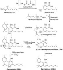 Phytocannabinoids are found throughout all major morphologies of cannabis. Cannabinoids are mixed polyketides derived from malonyl-CoA, hexanoyl-CoA units prenylated with geranyl phosphate.11–13 This biosynthetic pathway, shown inFigure 2 with the synthesis of CBD, THC, and CBN, produces several classes of phytocannabinoids.