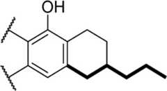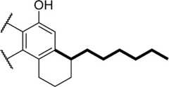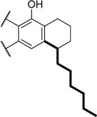 Since the initial discovery of THC and other related cannabinoids, numerous modifications and analogs were synthesized in an attempt to define the structure–activity relationship (SAR) of THC at both CB1 and CB2. Δ9-THC contains five major structural features, depicted inFigure 6: the C3 side chain, phenolic hydroxyl, and three rings: the aromatic A-ring, pyran B-ring, and cyclohexenyl C-ring. While not present in any natural cannabinoids, some important synthetic analogs replace the pyran B-ring with a substituted aliphatic chain, and as such, thesouthern aliphatic region is included as a major structural feature of classical cannabinoids.