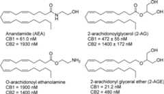 The identification of anandamide (AEA) by the Mechoulam group in 1992 confirmed its role as an endogenous ligand for the CB receptors, with aKi of 61.0 nM at CB1 and 1,930 nM at CB2.51,52 AEA produces similar effects to that of the exogenous phytocannabinoids, with administration to rodents of AEA inducing hypothermia, analgesia, catalepsy, and appetite stimulation.53,54 Furthermore, its tissue distribution is highly similar to that of CB1: the highest levels of AEA are found in the hippocampus and cerebellum and to a lesser degree in the spleen and heart tissue.55 Soon after the discovery of AEA followed the identification of several more endocannabinoids, namely, 2-arachidonoylglycerol (2-AG), withKi values of 472 ± 55 nM at CB1 and 1,400 ± 172 nM for CB2,O-arachidonoyl ethanolamine, withKi values of 1,900 nM at CB1 and 1,400 nM at CB2, and 2-arachidonoyl glycerol ether, withKi values of 21.2 nM at CB1 and 480 nM at CB2 (Fig. 4).56–59 Although initially considered an insignificant component of the endocannabinoid system, the role of 2-AG has evolved to that of one of the more important signaling molecules in the brain. 2-AG has been linked to the modulation of feeding, hypotension, neuroprotection, cell proliferation, and other interesting physiological processes.60–63