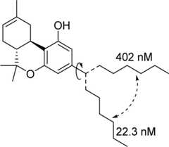 Utilizing the C3 alkyl chain as a point of diversification in classical cannabinoids has remained a staple of CB research since the discovery of Δ9-THC. Numerous analogs, containing a variety of carbon chains and rings with and without heteroatom incorporation, provided a well-defined and predictable SAR profile for this portion of the THC scaffold.