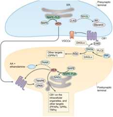 Synaptic endocannabinoid signaling. Dashed arrows indicate inactivation of endocannabinoid.