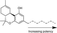 The length of the C3 side chain of THC directly correlates with CB1 and CB2 binding affinity; an increase in chain length leads to an increase in binding affinity at both receptors (Fig. 7). CB binding affinity data for methyl- or ethyl-substituted THC analogs have not been published; however, a study conducted in 2011 examined the functional activity of these THC analogs, demonstrating decrease in the receptor affinity in a linear fashion with decreasing chain length.83 Interestingly, this study found an inverse relationship between chain length and TRPA1 channel activity; a one-carbon chain was found to be a potent TRPA1 agonist, this effect decreasing with additional carbons on the chain. This may be a contributing factor to the biological significance of cannabinoids like propyl-substituted Δ9-tetrahydrocannabivarin, which does not activate either CB receptor yet retains numerous biological effects.