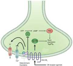 Neuronal CB signaling. Activation of a CB receptor with an agonist causes several downstream effects: inhibition of adenylcyclase and inwardly rectifying calcium channels, and activation of potassium channels as well as the mitogen-activated protein kinase pathway. Activation of MAPK modulates gene expression, depending on downstream signaling, cell types, etc. Gene expression can also be modulate as a downstream effect of adenylyl cyclase inhibition through the activation of protein kinase A.