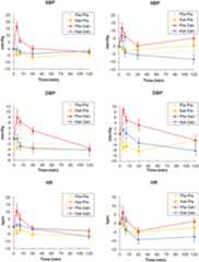 Cardiovascular effects were captured by measuring systolic and diastolic blood pressure (SBP and DBP, respectively) and heart rate (HR) while volunteers were in a recumbent position.