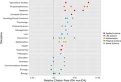 We revisedFigure 1 to include mean citation advantages (medians are often not reported). These are now shown as a relative citation rate, instead of percentage. We also expanded the figure to include more disciplines and more studies, including some in which an OA citation advantage was not found.