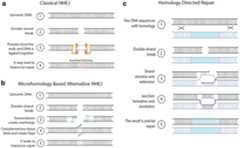 Major DNA repair pathways in plants. Non-homologous end joining (NHEJ) and homology directed repair (HDR) are two main repair pathways. Classical NHEJ may lead to insertions or deletions, while microhomology based alternative NHEJ always results in deletions. Homology directed repair is less efficient, but can result in precise integration of a donor DNA template into the genome