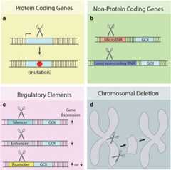 Most of these studies targeted protein coding genes for mutagenesis (Fig. 3a). Other types of NHEJ based editing can also be achieved by TALEN, such as targeted mutagenesis of non-protein coding genes (Fig. 3b) and regulatory elements [48] (Fig. 3c), and generating large chromosomal deletions [44] (Fig. 3d).