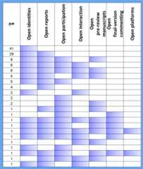 In short, things have not improved much since Suber made his astute observation. This continuing imprecision grows more problematic over time, however. As Mark Ware notes, “it is not always clear in debates over the merits of OPR exactly what is being referred to” (Ware, 2011). Differing flavours of OPR include independent factors (open identities, open reports, open participation, etc.), which have no necessary connection to each other, and very different benefits and drawbacks. Evaluation of the efficacy of these differing variables and hence comparison between differing systems is therefore problematic. Discussions are potentially side-tracked when claims are made for the efficacy of “OPR” in general, despite critique usually being focussed on one element or distinct configuration of OPR. It could even be argued that this inability to define terms is to blame for the fact that, as Nicholas Kriegskorte has pointed out, “we have yet to develop a coherent shared vision for “open evaluation” (OE), and an OE movement comparable to the OA movement” (Kriegeskorte, 2012).