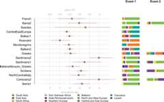 Admixture dates as inferred by GLOBETROTTER in the “non-local” analysis. We fit the painting profile of Western Eurasian populations into expected curves for different admixture models, as implemented in GLOBETROTTER. The estimated dates and sources composition are shown. When one date multiple way result was detected, two events are indicated. For each event the two putative source composition is separated by a white space in the barplot.
