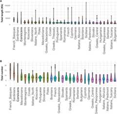 To explore whether Corsicans, as insular population, display characteristic traces of isolation and endogamy in their genomes, we assessed Runs of Homozygosity (RoH). RoH are uninterrupted segments of homozygous genotypes present in individuals. The number and extension of RoH stretches are correlated to the level of identity by descent and are largely affected by population’s demographic history28,29. Corsicans show an excess of RoHs indicated by the high median values of total number and total length of RoHs, next to Sardinians and French Basques (Fig. 1). This homozygosity pattern is characteristic of isolated populations with relatively low effective population size (Ne) and high degree of endogamy28–30. Similar to Sardinians and Basques, Corsicans show high variability of long RoHs, possibly indicating recent ongoing admixture.
