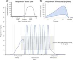 Progesterone levels across the lifespan: [Inset A) across the menstrual cycle, B) across pregnancy].