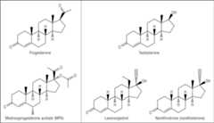 Chemical structures of progesterone and testosterone and for comparison common C-21 and C-19 related progestins.