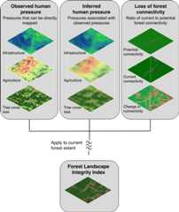 The Forest Landscape Integrity Index was constructed based on three main data inputs: (1) observed pressures (infrastructure, agriculture, tree cover loss), (2) inferred pressure modeled based on proximity to the observed pressures, and (3) change in forest connectivity.