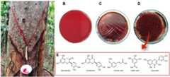 Virola oleifera in Espirito Santo, Brazil. The resin was collected from 0.5 cm-deep incisions in the tree trunk, as demonstrated in (A), and transferred into an amber glass vial (B). The fluid exudate was dried at 40 °C (C) and ground. Afterwards, the resin was sheltered from light at 4 °C until used as shown in (D). Previous chemical characterization by our research group revealed a high content of polyphenols, the main compounds demonstrated in (E) [16,33].