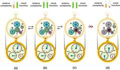 Ratchet-like processes build-up complexity by increasing the number of gears that underlie clock function. In a hypothetical clock, three gears (Gear H, Gear M, and Gear S) control the dials (hr, min, and sec, respectively). They are put in motion by the central gear (Gear C), which is powered by the battery (indicated by the green light at its center). From panela tob the clock increases in complexity. Stepa tob indicates the addition of a previously non-interacting gear (Gear N), which does not affect the function of the clock. Stepb toc introduces a defect in the central gear (Gear C), making the new gear (Gear N), which has its own power source, essential for the clock to function. Stepc tod separates the new gear (Gear N) from the rest of the machinery. This change renders the clock non-functional due to lack of access to power. In sum, the presence of a new powered gear (Gear N) introduces excess capacity, which provides the opportunity for another gear (Gear C) to lose power and results in an increase in complexity that is difficult to revert