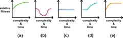 Evolutionary narratives that describe the evolution of complex features differ in the trajectories that relative fitness follows as well as in the number of steps required.a A traditional evolutionary tale for the progressive evolution of complex adaptations.b ‘Compensatory’, ‘rescue’, ‘error-correcting’ or ‘post-suppressive’ narrative for the evolution of certain complex features.c CNE narrative (also known as ‘pre-suppressive’ narrative).d Exaptive narrative where neutral evolution precedes adaptive evolution.e Combination of an adaptive phase that is followed by neutral evolution. All evolutionary narratives portrayed here are assumed to increase complexity