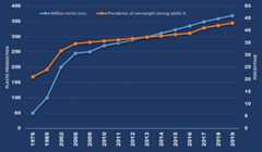 Global annual plastic production and prevalence of overweight over the past 4 decades (Source: Plastics - The Facts 2020, page 16; WHO:https://apps.who.int/gho/data/view.main.GLOBAL2461A?lang=e; Obesity data from: CDC:https://www.cdc.gov/nchs/products/databriefs/db360.htm).