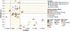 Summary of isotopic ratios, grave context, genetic affinities, and phenotypic information. Strontium and oxygen isotope data of the soldiers and civilians discussed in this paper. Symbols and symbol colors indicate grave context and genetic affinity, respectively. Associated colored squares indicate from left to right most probable hair, eye, and skin pigmentation (NA = not assessable). Shaded regions represent the local baselines of isotope values for Himera, measured from archaeological fauna in the case of strontium, and fromn = 93 humans from Himera’s civilian population in the case of oxygen; see ref. (37) for details on geochemical data.