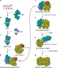 [Adapted from248 with image credit: molecular structures taken and adapted from the RCSB protein database, deposits 3JA8, 5ZR1139 5BK426, 5V8F249, 5XF8250, 6RQC251, 6F0L252, 6WGG and 6WGF253 and 7MCA254.)a shows the replication origin DNA (+ strand in cantaloupe color, - strand in lavender color), which inS. cerevisiae contains four elements (indicated as black segments) with A and B2 elements binding ORC in opposite orientations.b shows that ORC (in teal color) first binds to the A and B2 elements.c shows that ORC recruits Cdc6 (in orchid color).d shows that Cdt1-Mcm2-7 complex in open ring conformation (Cdt1 in Mocha color, Mcm2-7 in Asparagus color, a channel between Mcm2 and Mcm5 subunits is indicated) is recruited by ORC-Cdc6. DNA is aligned to the channel in the Mcm2-7 hexamer. The Mcm2-7 complex is oriented as the hexamer C-terminus binding to ORC-Cdc6.e shows the intermediate known as OCCM with the double stranded DNA inserted into the channel between Mcm2 and Mcm5 subunits in the Mcm2-7 hexamer. The hexamer is partially closed.f shows that the ATP hydrolysis by the Mcm2-7 expels the first Cdc6 and then Cdt1, creating the OM complex.g shows that ORC flips over to the N-terminus side of Mcm2-7 and presumably binds to the B2 element on DNA, creating the MO complex. The structure of the MO complex was modeled by real-space-refining docked coordinates of MCM (PDB 6EYC255), ORC (PDB 5ZR1139) and an N-terminal Orc6 homology134.h shows that ORC can now recruit a second Cdc6, creating a binding site for a second Cdt1-Mcm2-7 complex that can be loaded in an opposite orientation to the first Mcm2-7. The Mcm2-7 double hexamer, possibly with ORC still bound to the DNA, is then ready to be activated and can unwind the double stranded DNA when entering S phase.