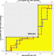 Relationship between ROC AUC and (TNR,TPR) points. Consider the pointX in the ROC space with coordinates. For clearness’ sake, we use the alternative formulation, using the reverse x axis true negative rate, complement to 1 to the original FPR axis, so that. This is graphically represented in Fig. 1.