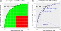 Numerical approximation of some landmark values of yielded by a high ROC AUC of 0.785, that approximates. For example, if TNR is 0.35, then TPR must be greater or equal to 0.670. Due to the symmetric nature of the necessary condition Eq. 9, the relation between the two rates and holds when swapped. means that TNR can have any value in the [0; 1] range and means that TPR can have any value [0; 1] range. Please notice that the half semicircle ROC represented by the blue line in Fig. 3b has AUC, but there are several other ROC curves with the same AUC