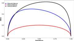 As a first step, we study the connection between points in the ROC space and the corresponding MCC. Despite the fact that MCC is generally acknowledged as robust against imbalanced datasets, this does not yield that MCC is independent of the class ratio. Actually, as shown by the MACQ Consortium [57], if we introduce the prevalence as the ratio of the actual positive samples over the total number of samples, by definition specificity (TNR) and sensitivity (TPR) do not depend onp, while MCC does.