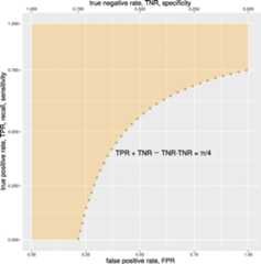 More precisely, if the Cartesian distance between each point of the ROC curve and the bottom right corner point is always equal to 1, we have a half semicircle with area (Fig. 3b). If each distance is always 1, then must be equal to 1, too. If both TPR and TNR can range only in the [0; 1] intervals, then and.