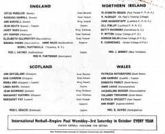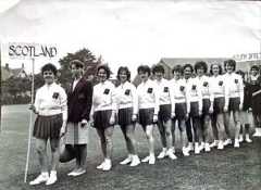 Scotland team (right of picture) from centre – Theresa Rice (McCartney) #20 captain, Margaret Devine #19, Kathleen McGinley (Farrell) #18, Susan Hepburn (McLennon) #21, Elizabeth Loudon (Gavigan) #11, Sheila Donald (Ferguson) #22, Lena Fraser (Calder) #23