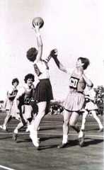 Moira Ord MBE #41 earned her first Thistles cap playing in the match against South Africa in 1959 and recalls that “the match was played on an ice rink that had been covered by a wooden flooring. By the time the South Africa vs Scotland match was due to start the ice had begun to melt and made the wooden flooring very slippery and extremely dangerous. Within a short space of time Scotland’s attack [GA Sheila Ferguson (Donald)] player fell and badly sprained her ankle. Some quick changes were made to the Scottish team, I went to attack [GA], May Rooney to centre and Agnes Woulfe (reserve) moved to an attacking centre. No wonder we didn’t win!!!”