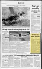 Huskies lose third in a row Day Staff Reports Cincinnati - UConn quarterback Dan Orlovsky set the school's freshman record for passing yards, but also threw two interceptions and fumbled twice in the Huskies' 45-28 loss to Cincinnati Saturday afternoon at Nippert Stadium. Orlovsky (27 of 50, 382 yards) connected on touchdown passes of 15 and 7 yards to tailback Chris Bellamy, and 48 yards to Jasen Ridley. The strike to Ridley pulled the Huskies within 31-21 mid- Cincinnati 45 way through the third quarter. UConn 28 But a few minutes later, the Bearcats (5-3) broke the game open when Zach Norton returned an Orlovsky interception 15 yards for a touchdown to give his team a 38-21 lead. Cincinnati made it 45-21 early in the fourth quarter, when running back Nathan Wize scored from 13 yards out. DeMarco McCleskey ran for 101 yards and a touchdown, and freshman quarterback Gino Guidugli passed for 245 yards and a touchdown - and ran for another - as Cincinnati bounced back from last week's costly Conference USA loss to Louisville. This was the third straight loss for the Huskies (2- 6), who once again struggled to establish a running attack. Cincinnati, which had been allowing 196.1 yards per game on the ground before the day began, held UConn to 28 yards on 25 attempts. It was left to Orlovsky to generate most of the offense, and he distributed the ball to nine different receivers. Wes Timko established career highs with five catches for 109 yards, while Cliff Hill (7 catches, 61
