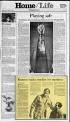 Romero trades zombies for monkeys By George Anderson Magazine Editor, Post-Gazette ombies are pussycats compared Z is to That's learning monkeys. what on the George set of Romero his current feature "Monkey Shines," which has been shooting in Pittsburgh since July. There has been no report in all those weeks from the almost windowless gray block building in Moon, just behind the West Hills Shopping Center. Movie fans may have wondered just what Romero is up to this time, what diabolical plot is being hatched in this forbidding penitentiary-like structure built to be a sound stage for films. It could be his most dangerous movie yet - but not in terms audiences usually associate with Romero. This time the risk is of another sort, the kind that goes with casting against type. Romero, the amiable keeper of the zombies of Western Pennsylvania, is dealing with another species in "Monkey Shines." Whatever that title may suggest at this time, it has nothing to do with straying politicians or media-manipulating models. The monkey on Romero's back is a real one, a capuchin, which is actually played in the film by five monkeys, only one of which does closeups. Working with these comic-looking little creatures has turned out to be the sort of nightmare usually associated with caves, cemeteries and mysterious big boxes in Romero movies. Monkeys, even supposedly trained monkeys, have minds of their own. They don't always like to do what they're told to do. The results have been days in which getting the right shot can consume four hours. Executive producer Charles Evans said, "When it comes to temperament, these monkeys make every actor look good." Evans ought to know something about that subject. He worked on "Tootsie," which has become legendary for its actor-inspired battles. As a director, Romero is among the most patient of men. He is not known for raising his voice or losing his temper. "He has never had to be as patient as this before," said Evans. Evans, by the way, is the brother of producer and former Paramount Pictures head Robert Evans. Looking dapper in blue blazer and gray slacks, he has the well-cared-for look of a jetsetter, and i is repeatedly visited by VIP Myles Aronowitz photo George Romero, left, and Jason Beghe on set of "Monkey Shines." friends. This is his first project with Romero and he is on the set every day. The days are killers. Shooting on "Monkey Shines" goes from 9 a.m. to 9 p.m. daily with a half-hour lunch break about 3 p.m. For Romero, that means the day starts several hours earlier and winds up about 11 p.m. six days a week. On the seventh day, he works with the film editor. "It's the toughest shoot we've ever had," said Christine Forrest Romero, the director's wife and assistant, playing a major role in "Monkey Shines.' Wearing jeans and denim shirt, with his traditional good-luck scarf hanging from a belt loop, Romero looks lean. He movie - "the real Hollywood always loses weight while shooting, a calls it. The film deals with a former college track star who is quadriplegic after being hit by a truck. A friend persuades him to use a CONTINUED ON PAGE 21