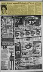 Eaton named Defensive Player of Year has." didn't have to pay the Warriors United Press International Mark Eaton, who once aspired to being a "good backup center,' yesterday was named Defensive Player of the Year in the National Basketball Association. Eaton, a 7-foot-4 center for the Utah Jazz, became the first player in NBA history to lead the league in blocked shots by a 2-1 margin. He had 456 blocks; Houston's Akeem Olajuwon was second with 220. "I just wanted to be a good backup center," said Eaton, who was drafted in the fourth round out of UCLA after playing a total of 41 minutes in his senior season. "I really felt I could affect the game, but I needed to improve. Frank (Layden, Jazz coach) gave me that chance." Said Layden: "He has become a force in the league. We used to go through airports and people would say, 'Look at that big lug.' Now they say, 'Hey, there's Mark Eaton." Eaton's 456 blocks broke the record of 393 set by Elmore Smith. Eaton also topped Smith's per average of 4.85 blocks with a 5.56 average. In addition to his shot-blocking, Eaton led the NBA in defensive rebounds with 720. In the Houston series, won by the Jazz, three games to two, Eaton broke Kareem Abdul-Jabbar's NBA playoff records for most blocks in a game (10) and in a five-game series (29). Eaton said he wishes the NBA kept blocked-shot records nba news during the Bill Russell and Wilt Chamberlain era. "To an extent, I'd like to compare myself against them," he said. But Layden said Chamberlain was never a great shot-blocker and that Russell, "while a great player," didn't compete against "the caliber of players now in the NBA." "Mark has earned this award with hard work, with a lot of hard work during the summer," said Layden, who termed Eaton "a project" upon drafting him in 1982. "It's his willingness to work that has paid tremendous dividends. I really didn't think he would become as good as he Eaton got 32 votes from a nationwide panel, consisting of three media members from each city who regularly cover the NBA and nine national members. Milwaukee Bucks guard SidMoncrief, who won the ney award the past two seasons, was second with 13 votes and teammate Paul Pressey was third with 10 votes. Elsewhere in the NBA: • Because Sacramento is about 80 miles from San Francisco, the newly arrived Sacramento Kings will pay the Golden State Warriors $850,000 over the next five years to soften the impact of moving into Warrior territory next Bob Whitsitt, Kings assistant general manager, said the team anything under NBA rules. But he said the Kings decided to do SO to "show the good spirit of cooperation, to develop promotions. The Kings moved from Kansas City on April 3. • The Detroit Pistons are a game away from elimination in the playoffs, but Pistons guard Isiah Thomas said the pressure is on Boston. "There is no pressure on us," he said. "All the pressure is on Boston. We weren't supposed to get this far." The Celtics have a threegames-to-two lead. The series resumes tonight in Detroit. The winner of the Boston-Detroit series plays Philadelphia in the Eastern Conference finals. Mark Eaton Leader in blocked shots