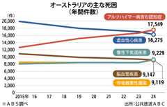 豪政府統計局(ABS)が公表した最新データで、認知症がオーストラリア人の死因で1位となり、心疾患や肺がん、交通事故を上回った。2024年にはアルツハイマー…