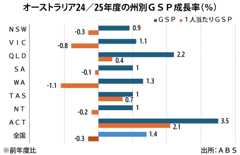 オーストラリアで経済規模が最大のニューサウスウェールズ(NSW)州は、2024/25年度(6月期)の州内総生産(GSP)成長率が年率0.9%増と、全国で伸びが最…