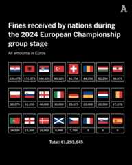 National football associations represented in this summer’sEuropean Championship have been fined more than €1.2million by organisersUEFA during the tournament group stages.