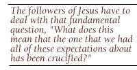 The followers of Jesus, who don't go away as they're supposed to ... have to deal with that fundamental question, - what does this mean that the one that we had all of these expectations about has been crucified? How do we deal with this, not merely the end of this life, but the shameful end of this life? And, the amazing thing is, they said, "Hey, Pilate's right - he was the King of the Jews, and moreover, God has vindicated this claim, that he is the King of the Jews, by raising him from the dead." Now, this is where the Jesus movement properly understood, which is to become Christianity, begins, with trying to explain that hard fact....