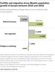 Between mid-2010 and mid-2016, the number of Muslims in Europe grew considerably through natural increase alone – that is, estimated births outnumbered deaths among Muslims by more than 2.9 million over that period. But most of the Muslim population growth in Europe during the period (about 60%) was due to migration: The Muslim population grew by an estimated 3.5 million from net migration (i.e., the number of Muslims who arrived minus the number who left, including both regular migrants and refugees). Over the same period, there was a relatively small loss in the Muslim population due to religious switching – an estimated 160,000 more people switched their religious identity from Muslim to another religion (or to no religion) than switched into Islam from some other religion or no religion – although this had a modest impact compared with births, deaths and migration.1