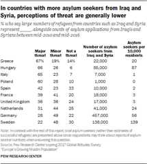 Does public opinion toward refugees invariably turn negative as their numbers rise? Apparently not. In some European countries that have attracted large numbers of refugees from Iraq and Syria, public levels of concern about these refugees are relatively low. Meanwhile, in some countries where there are fewer refugees from Iraq and Syria, a much higher share of the public says they pose a “major threat,” according to a2017 Pew Research Center survey.