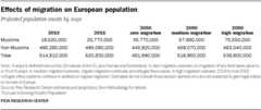 Taken as a whole, Europe’s population (including both Muslims and non-Muslims) would be expected to decline considerably (from about 521 million to an estimated 482 million) without any future migration. In the medium migration scenario, it would remain roughly stable, while in the high migration scenario it would be projected to grow modestly.