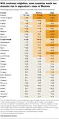 Some countries would experience little change in any of the scenarios, typically because they have few Muslims to begin with or low levels of immigration (or both).